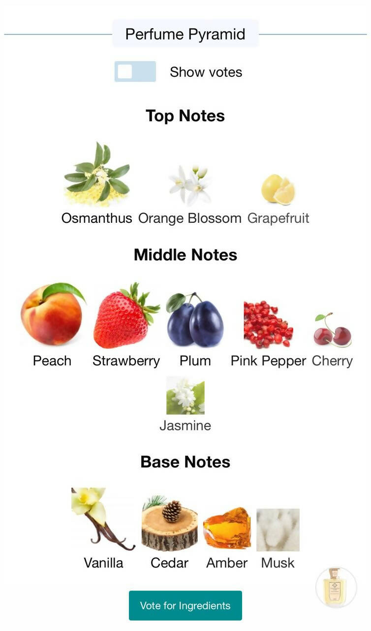 قلب العطر الخوخ، الفراولة، البرقوق، الفلفل الوردي، الكرز، الياسمين