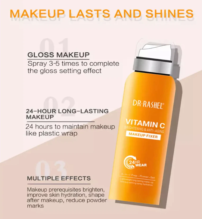 إعداد الماكياج رذاذ غني بفيتامين C ، والذي يعد من بين أبرز الفيتامينات التي تحمي وتغذي الجلد لتخفيف الجلد ومقاومة علامات الشيخوخة.
